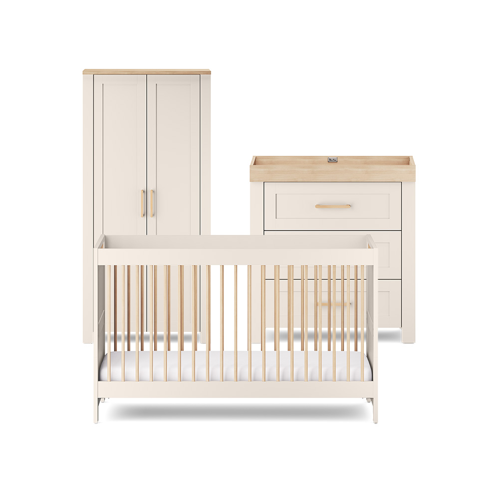 Our Seville 3-piece nursery furniture set is complete with everything you need to create your baby’s first bedroom – a versatile cot bed, changer dresser and spacious wardrobe. With clean, elegant lines and gender-neutral tones of soft cashmere and natural oak, Seville invites a fresh and calming feeling into any nursery space. Designed to ensure timeless, long-lasting quality, our Seville nursery furniture set can be enjoyed for years to come as your family grows.