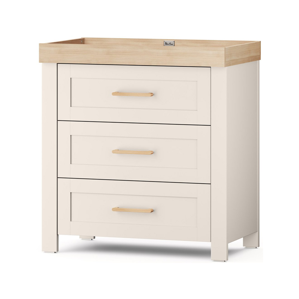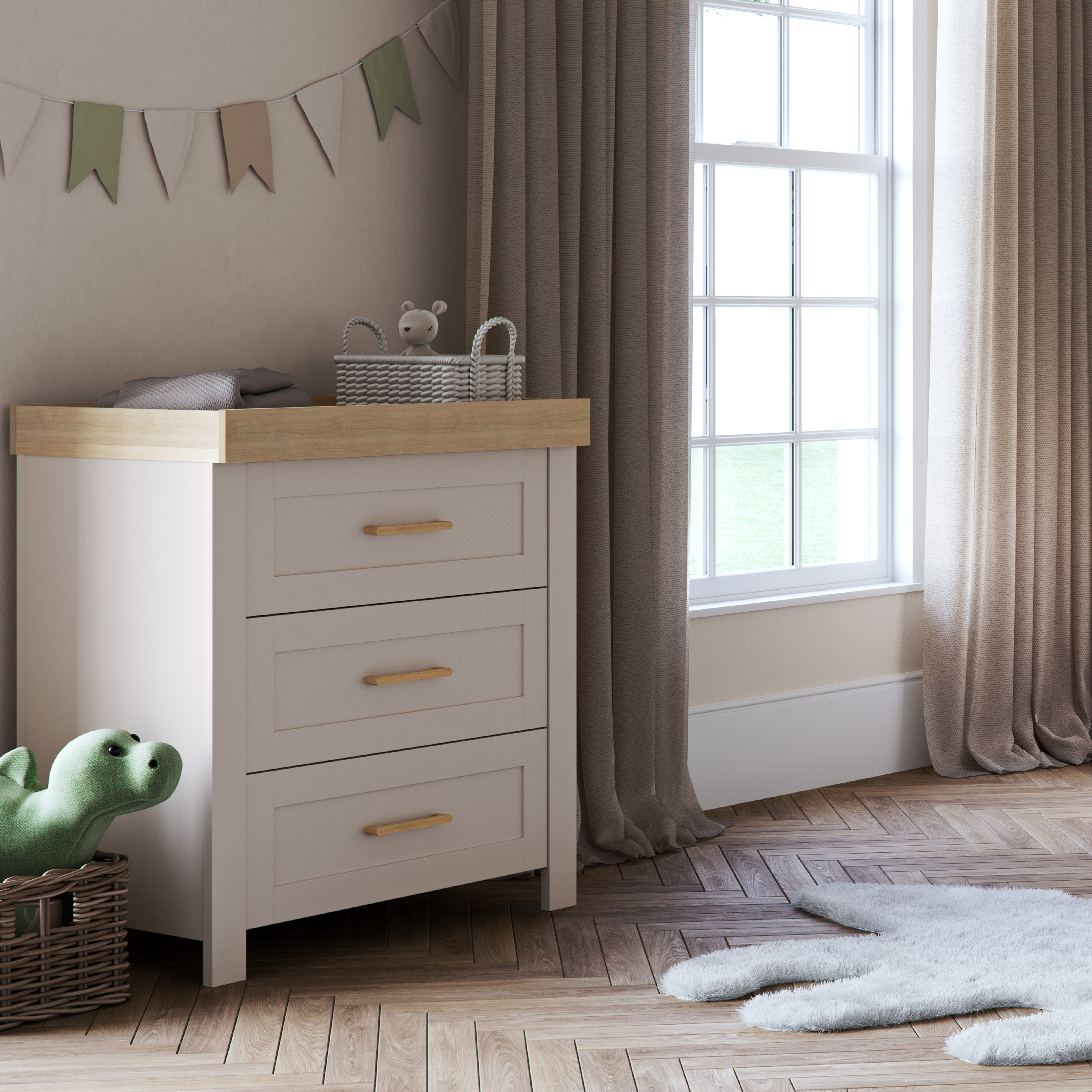 Stay organised in your nursery with the Seville full size dresser, featuring three deep drawers with plenty of space for your baby’s essentials and a removable changer top. With clean, elegant lines and warm tones of soft cashmere and natural oak, Seville brings a fresh and calming feeling into any nursery space. With a timeless design and long-lasting quality, our Seville nursery furniture set can be enjoyed for years to come as your family grows.