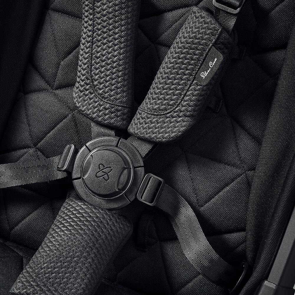 Clic’s soft-cushioned leatherette bumper bar is compatible with the Silver Cross snack tray, while the UPF50+ hood, sun visor and ventilation panel with magnetic fastening keeps them cool on warmer strolls.