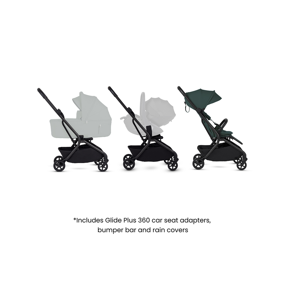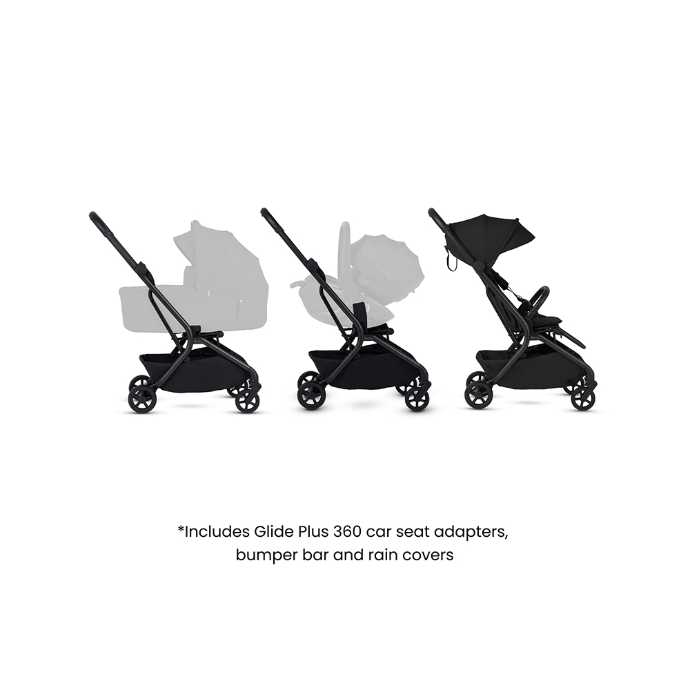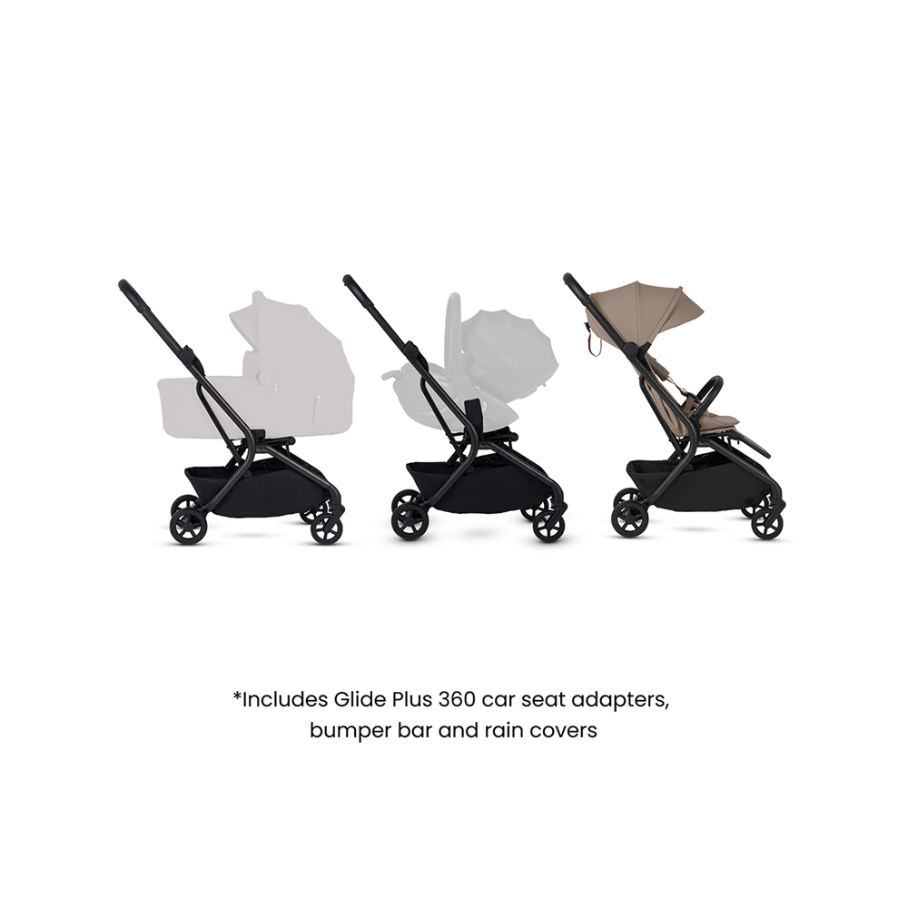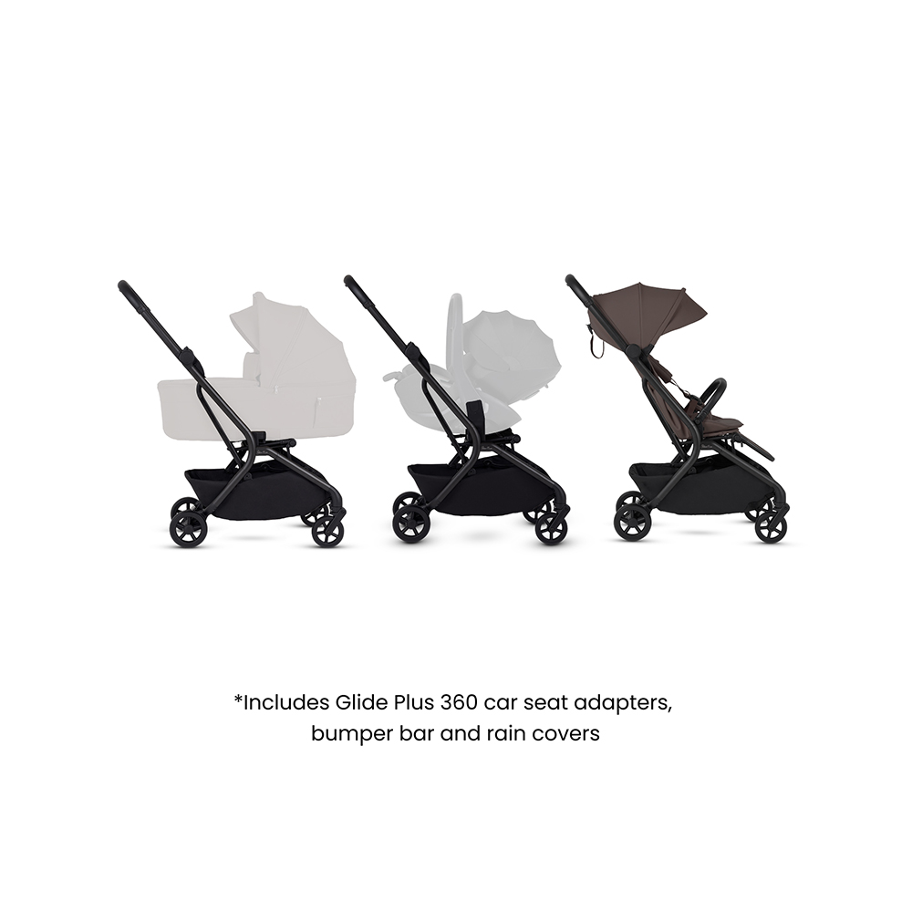 Transform Nia into a complete newborn travel system by attaching the Glide Plus 360 car seat with the included adaptors.