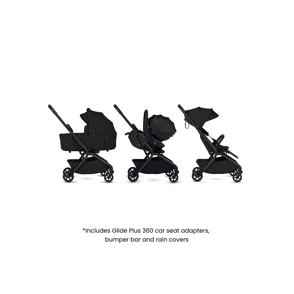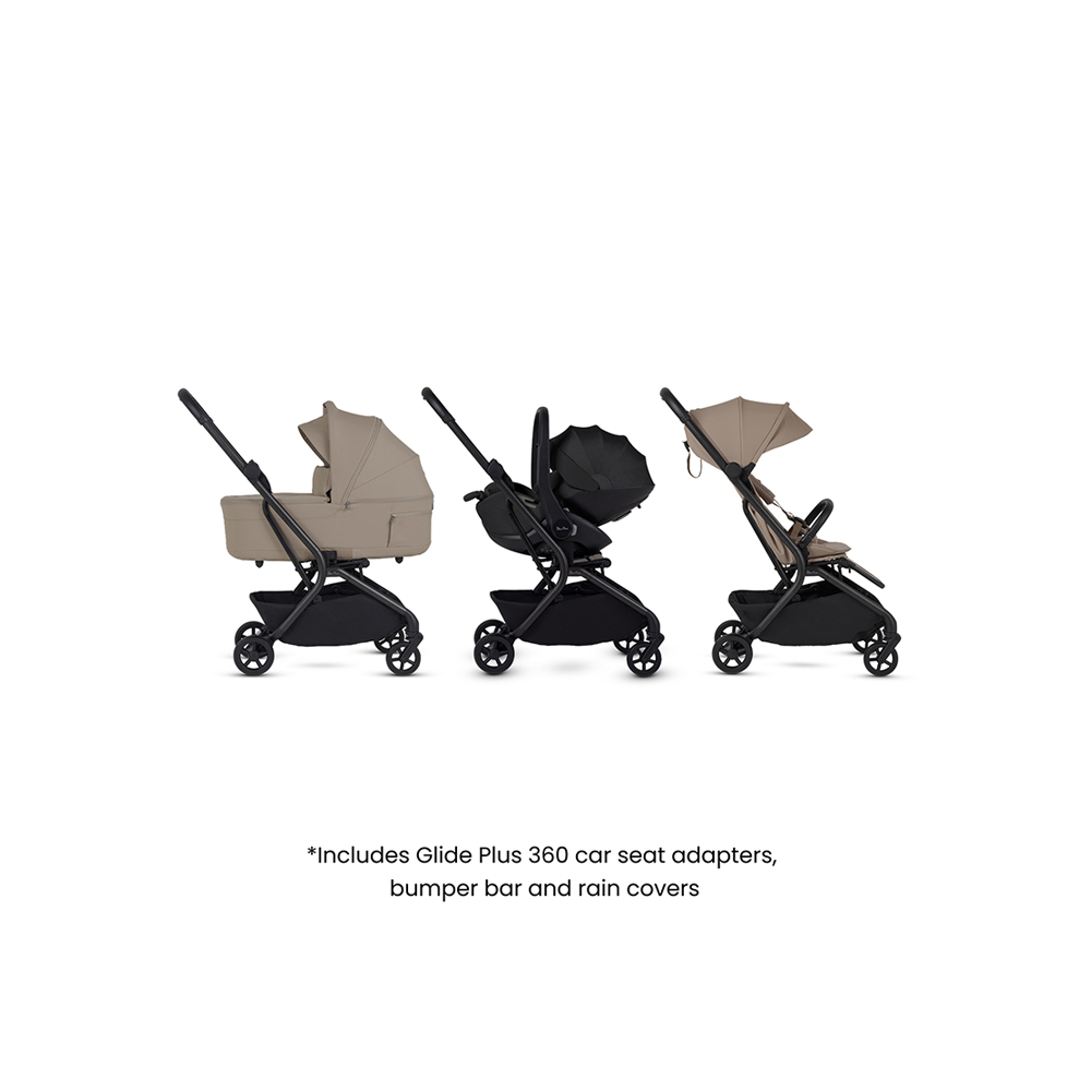 Transform Nia into a complete newborn travel system by attaching the Glide Plus 360 car seat with the included adaptors.