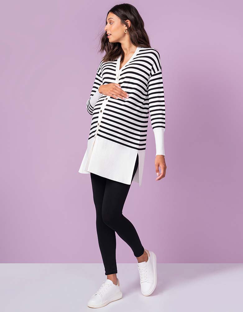 The trick is to balance out loose A-line tops with more fitted bottoms, such as maternity leggings or skinny jeans. For a more relaxed look, they can be teamed with an oversized shirt for a relaxed weekend look.