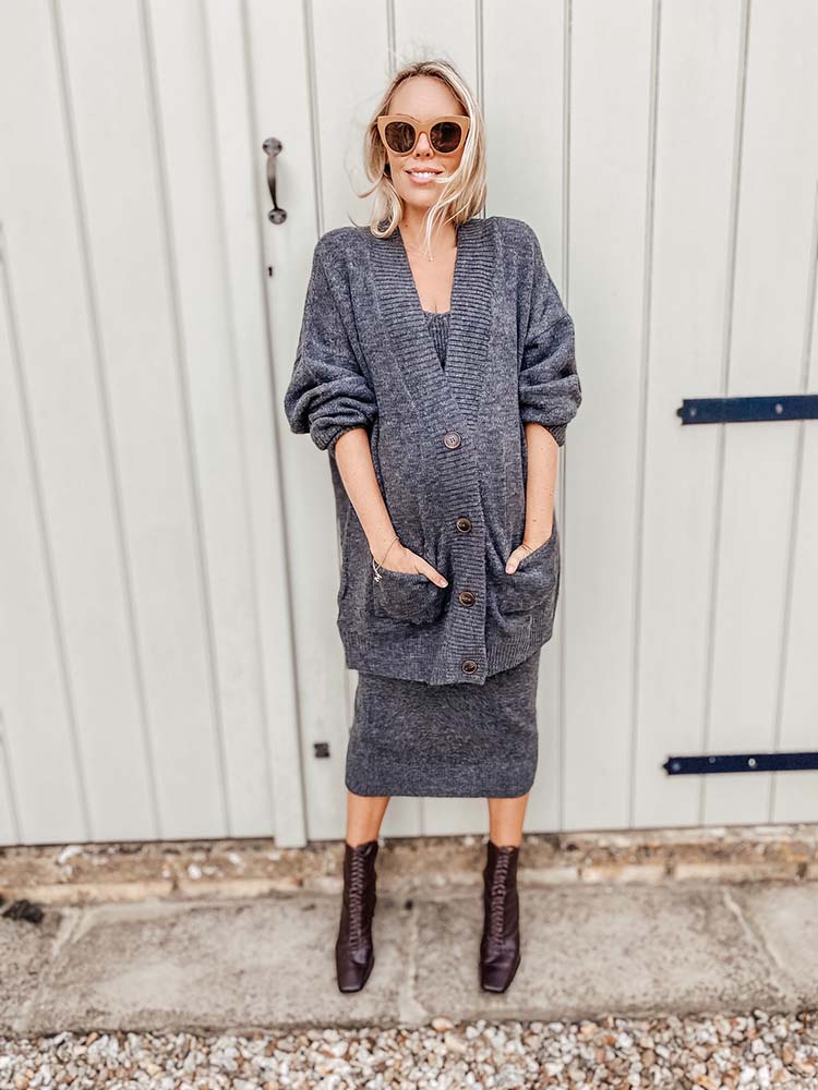 Another oversized item that became a main feature in my wardrobe was the longer length cardigan. Worn done up over the bump or loose as a layer, it worked with my changing shape and is a key piece for post-partum nursing too.