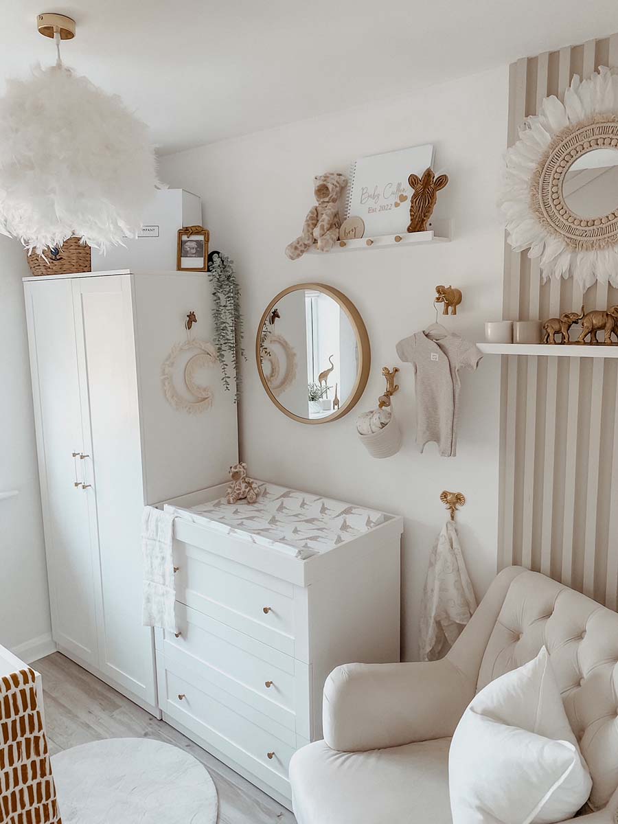 Being playful with patterns, wallpaper and geometric walls can work well, but you can also keep it super simple just painting the walls. Green mixed with other earthy colours like stone and white is a gorgeous palette for a gender-neutral scheme too.