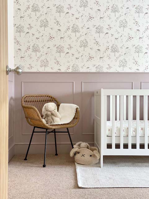 To achieve this, we chose to combine panelled walls with beautifully patterned wallpaper. We actually fell in love with the wallpaper first and designed the rest of the room to complement it, resulting in a soft colour palette of muted pinks and creams. The panelling adds character, whilst the subtle woodland theme of the wallpaper gives the space an enchanted feel.