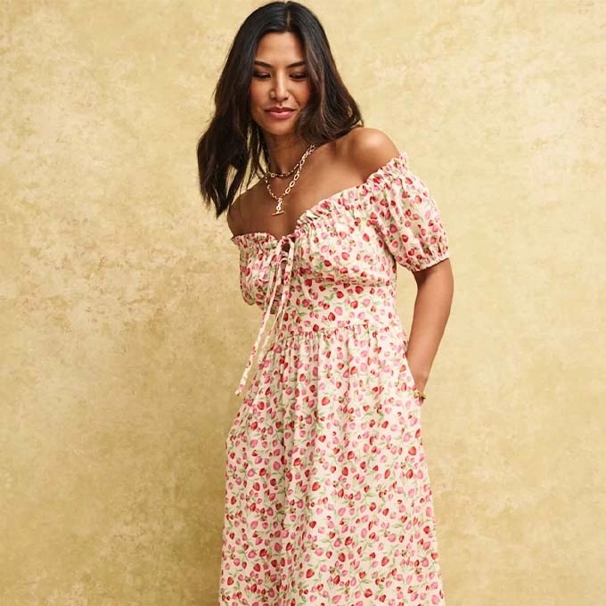 Nothing beats a bardot dress, and this strawberry-printed midi from a Nobody’s Child is a definite winner for a daytime guest. The off-the-shoulder design and string ties make it perfect for slipping on and off your shoulder between feeds at your summer wedding.