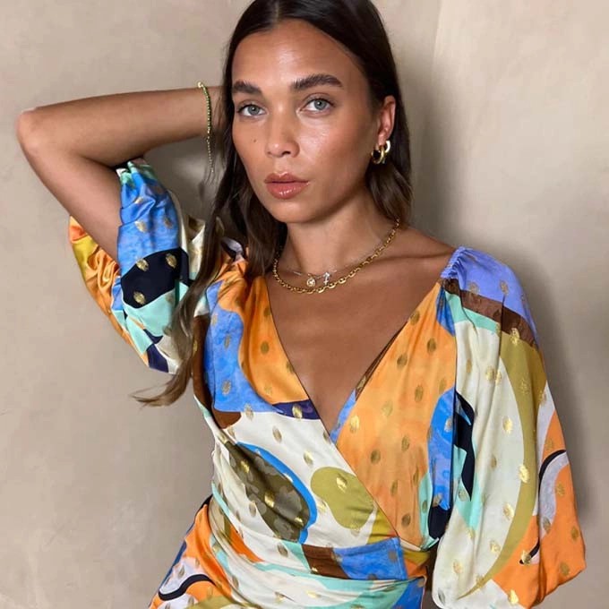 Perfect for a destination wedding, the ‘Gigi Sadie’ dress will make a statement in the sunshine with its orange and blue tones and glistening gold fleck details. The tie-wrap design means you can adjust the neckline and slit for less or more coverage to find your most comfortable style.