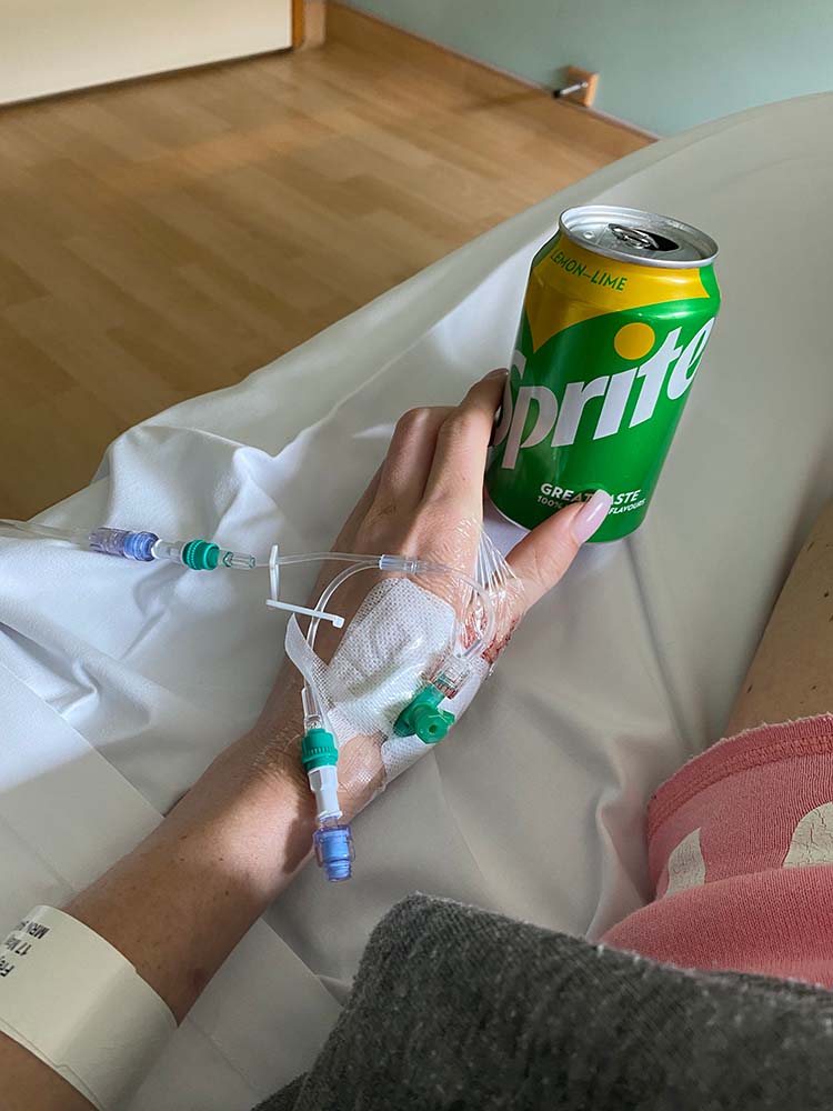 One rainy Sunday night I hadn’t kept anything down for 10 days straight, so it took all my energy to make it to the hospital (car journeys were hell). I cried to the consultant and he said if you can keep down one can of Sprite a day, you'll be OK (it had to be full-fat Sprite because of the salt and sugar content, and from a can). Is that seriously enough to keep me alive, let alone the baby?! The whole way through my pregnancy people would say the baby will always be fine because they take what they need and obviously that was great, but what about me? I am not fine, and if I am not fine in the long-run how is the baby going to be fine?