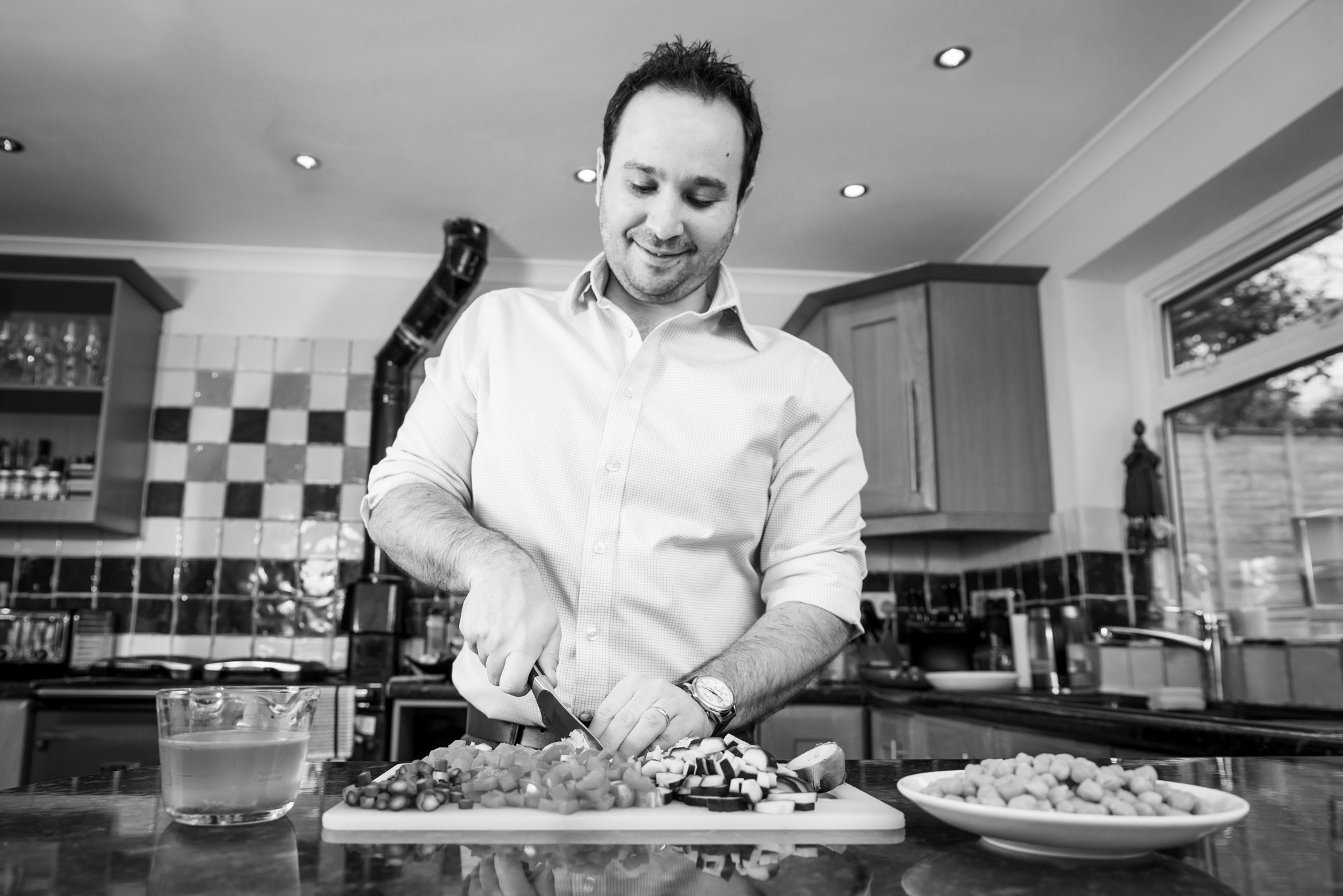 - Whilst the aubergine is cooking, dice an onion and fry in a teaspoon of olive oil. Add the remaining cinnamon, ground coriander, cumin and garam masala to the pan and mix well. Whilst that’s cooking dice three cloves of garlic and grate an inch of ginger. Add to the pan and cook for a further minute.