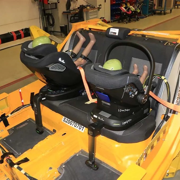 Three different impact orientations are used to replicate a frontal, side, and rear crash. A child seat will be tested with both the smallest and largest size dummies in each of these configurations. For example, an infant carrier would be tested with a Q0 dummy and a Q1.5 dummy which resemble the size of newborn and 18-month-old babies respectively. If the child seat has any possible adjustments such as a recline, both the extreme upright and recline positions will be tested. Also, if the seat features a support leg or top tether (known as an anti-rotation device as they stop the seat tipping forwards), we conduct a misuse test with the largest test dummy, to replicate what would happen if these were not used correctly.